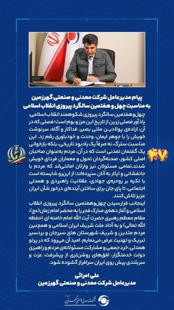 پیام مدیرعامل شرکت معدنی و صنعتی گهرزمین به مناسبت چهل‌وهفتمین سالگرد پیروزی انقلاب اسلامی
